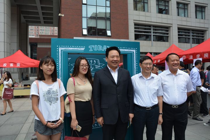 当天上午,学院院长唐忠教授、党委书记张利庠教授先后来到学院报到台,与报到的学生及家长们热情交谈,特别叮嘱志愿者要充分向新生介绍学校的绿色通道,让家庭有困难的同学及时的得到帮助,满足基本的物质需求,顺利进入学院学习。上午10时,陈雨露校长与各相关机关部处负责人一行,也来到学院的迎新报到台前,询问学院的迎新具体安排和新生报道情况,并在我院的背景墙前与学院领导和新生代表合影留念。当得知学院2015级本科生张凌波同学高考的第一志愿填报的是农业与农村发展学院时,陈雨露校长还鼓励他们几位新同学说:“加油!希望你们越来越喜欢农发学院!”