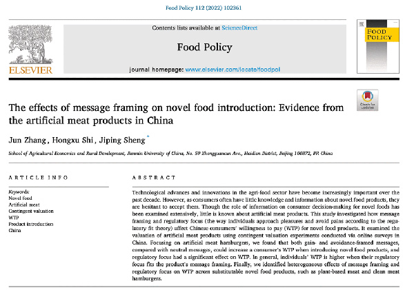 2022-09-23近日,我院师生在农业经济领域国际著名学术期刊《Food Policy》发表题为“The effects of message framing on novel food introduction: Evidence from the artificial meat products in China”的文章(论文链接:https://doi.org/10.1016/j.foodpol.2022.102361)。该研究是我院张君副教授、博士生石鸿旭以及生吉萍教授的共同成果。这项研究旨在探究信息框架和聚焦调节对消费者购买新型食品支付意愿的影响。