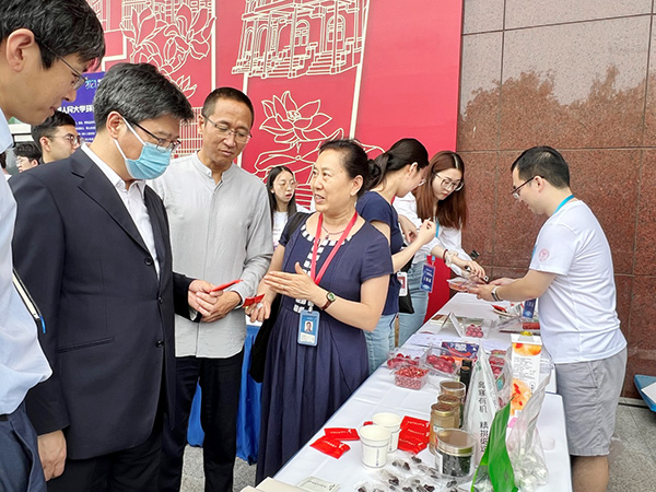 林尚立校长在农业与农村发展学院展台询问了展出的有机红枸杞的相关情况,并听取了毛学峰、生吉萍两位老师对我院食品经济管理研究的现状和有机食品产业的发展前景的介绍。林校长高度评价了农业与农村发展学院为乡村振兴培养高端人才做出的贡献,肯定并支持我院目前在三农领域的探索实践。林尚立校长还与志愿者和现场体验同学进行了亲切的互动交流。