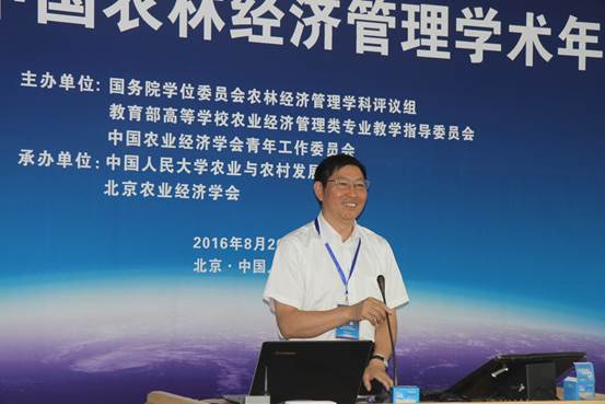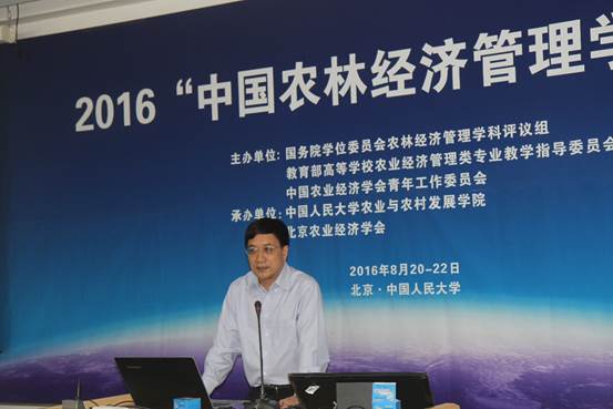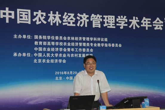 2016-08-228月22日上午11时,2016中国农林经济管理学术年会第二场学术前沿报告会与闭幕式在中国人民大学明德法学楼0101教室举行。报告会与闭幕式由中国农业经济学会青年工作委员会主任委员、中国人民大学苏州校区党委书记、中法学院和国际学院院长、农业与农村发展学院教授朱信凯主持。
