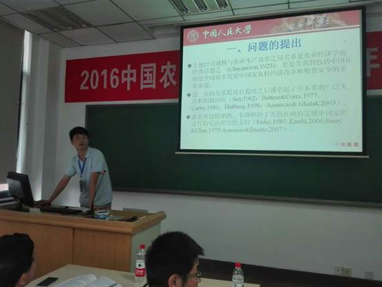 市场流通和国际贸易分论坛会场,来自南京农业大学,中国农业大学,华中农业大学的同学做了中澳自贸区对我国农产品加工的影响,乳制品进口对乳制品加工业的影响,农产品的对外贸易是否影响了中国环境等主题报告,哥廷根大学的于晓华教授和中国人民大学的毛学峰副教授针对汇报对研究方法、选题、未来研究方向等方面做了相关点评,与会者也进行了积极讨论。